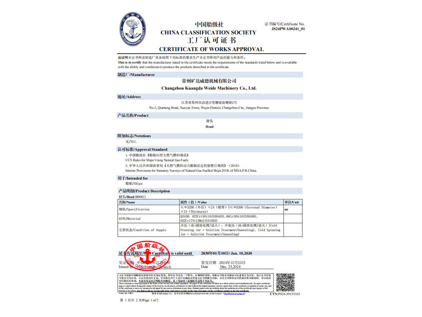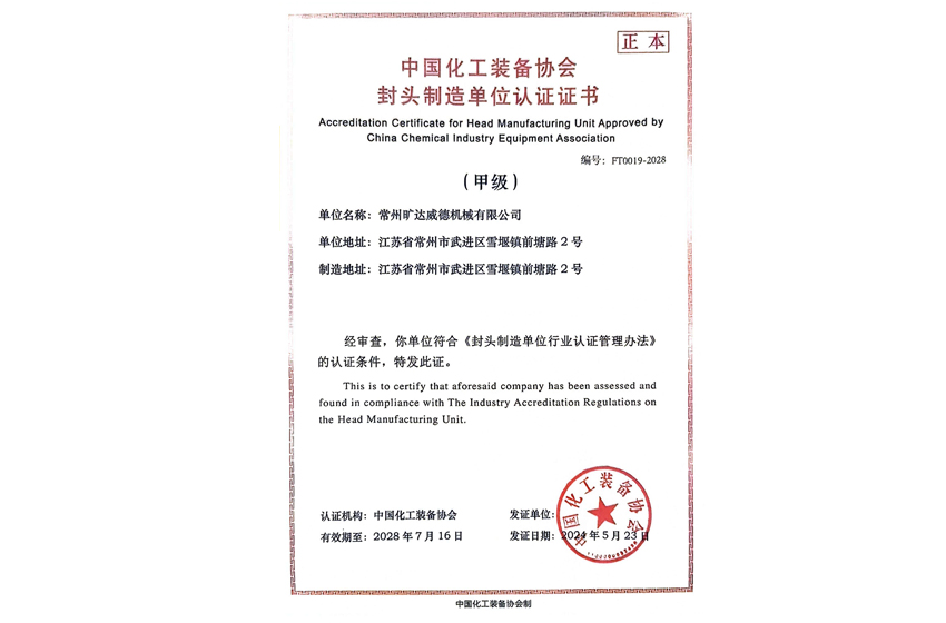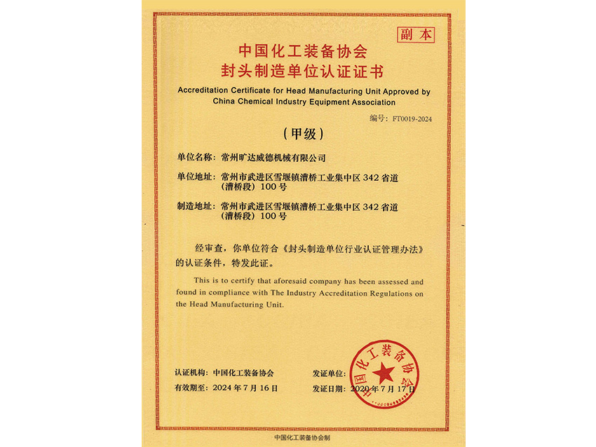 中國化工裝備協(xié)會(huì)封頭制造單位認(rèn)證證書(甲級(jí)) |