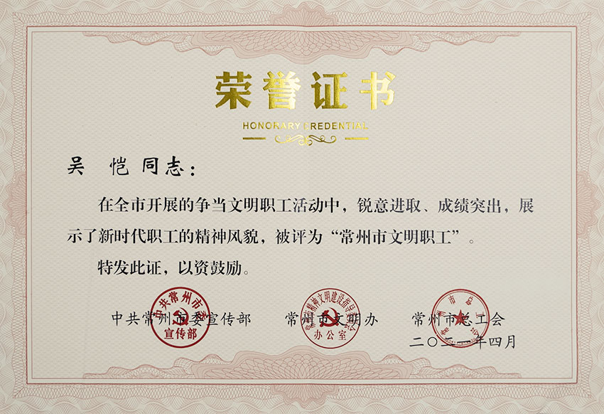 2021年常州市文明職工榮譽(yù)證書 |