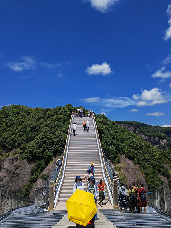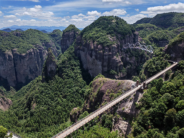 第二站我們來到了號(hào)稱神仙居住地的大神仙居景區(qū)。公元1007年,宋真宗以其“洞天名山,屏蔽周圍,而多神仙之宅”,下詔改名仙居。神仙居引人入勝之處,在于一山一水、一崖一洞、一石一峰都自成一格。一字蔽之:“奇”。峰奇、山奇、石奇、崖亦奇。自縣城出發(fā),迤邐西行,大雷山,括蒼山,均綿延不斷。唯獨(dú)白塔鎮(zhèn)南境,神仙居周圍的眾山巍兀獨(dú)立,險(xiǎn)峻無比,迥然各異。半路上,導(dǎo)游介紹說神仙居是世界上規(guī)模****的火山流紋巖地貌典型,不禁給這次的游覽增加了幾分神秘。 懷著期待的心情,我們從景區(qū)南門上山。隨著纜車的逐漸爬高,山腳下的一汪水池已然變成碧綠的“小水坑”,宛若一顆散落在人間的藍(lán)色寶石。遠(yuǎn)處的山峰和湛藍(lán)的天空交相呼應(yīng),半山腰的云朵仿佛觸手可及。就連那云朵撒在山間的陰影看上去亦是十分有趣,像極了一個(gè)個(gè)黑色的腳印,怕是哪位仙人經(jīng)過留下的。隨著腳步的推進(jìn),轉(zhuǎn)眼間來到祈愿臺(tái),一座巨石映入眼簾,只見她雙手作揖、肅然危坐,神情安祥,這就是“觀音巖”。觀音巖是神仙居景區(qū)標(biāo)志,海拔919米,巖高200多米,這座天然形成的巨石會(huì)讓你再次感嘆大自然的鬼斧神工。隨著觀音巖角度的變換,游覽的隊(duì)伍到達(dá)了南天頂。南天頂玻璃觀景臺(tái)并非神仙居制高點(diǎn),但視野開闊,適合總覽景區(qū),如果你敢于挑戰(zhàn)自己,站上玻璃平臺(tái),你會(huì)發(fā)現(xiàn)近山挺拔、遠(yuǎn)山如黛、風(fēng)景如畫,令人流連忘返。 此次神仙居之旅,我們南上北下不走回頭路。走下南天頂,沿著棧道不一會(huì)兒便來到了南天橋,走在橋上,看著腳下的萬丈懸崖,人們不由得神情緊張,微微晃動(dòng)的橋身更使得我們不敢多作停留。沿著山腰的棧道繼續(xù)往前走,轉(zhuǎn)個(gè)彎,又一個(gè)網(wǎng)紅打卡景點(diǎn)映入眼前,她神似一朵開在山間的藍(lán)蓮花,故稱蓮花臺(tái),這是又一個(gè)觀賞觀音巖的絕佳位置。稍作休息調(diào)整,我們便起身前往神仙居最火的網(wǎng)紅橋——如意橋。走過一段曲折起伏的山路,終于來到她的面前,其剛?cè)岵?jì)的造型與神仙居的自然風(fēng)光完美融合,宛如空中之玉,仙女之絲。大橋奇特的造型由三塊起伏的流線型橋面組成,上層橋面是一塊中空的鐵板,走在上面,每一步都能讓人如履薄冰。在眾多的魅力自然風(fēng)光里,如意橋也能做到毫不遜色,她巧妙地用流暢的線條融合了鋼筋鐵泥的“硬朗”與旖旎風(fēng)光的“柔和”。站在橋上面,開闊的視野讓游客更好地領(lǐng)略神仙美景。