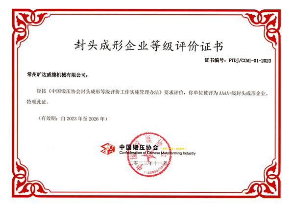 本次評價工作嚴(yán)格依照T/CCMI 14-2022團(tuán)體標(biāo)準(zhǔn)《封頭成形企業(yè)等級評價》進(jìn)行,經(jīng)參評企業(yè)參照該團(tuán)體標(biāo)準(zhǔn)填報自評、中國鍛協(xié)組織專家評審、公示后,在2023年中國封頭成形分會會議上進(jìn)行頒證、宣傳。 對封頭成形企業(yè)的評價評級,有利于提高封頭成形企業(yè)技術(shù)與管理綜合實力,改善行業(yè)競爭環(huán)境,培養(yǎng)品牌封頭企業(yè),為我國裝備制造業(yè)提供優(yōu)質(zhì)封頭零件,進(jìn)而提高封頭成形企業(yè)的國際市場競爭力。曠達(dá)威德也將以再次獲評此榮譽(yù)為契機(jī),進(jìn)一步致力于技術(shù)與裝備的升級及工廠信息化建設(shè),不斷把握新市場、新形勢、新機(jī)遇,追求新突破、新發(fā)展、新業(yè)績。