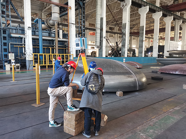 此次曠達(dá)威德誠意邀約公司技術(shù)領(lǐng)域的專家李教授來司調(diào)研,主要是通過引進(jìn)人才,讓其結(jié)合自己的專業(yè)方向,針對企業(yè)的實(shí)際生產(chǎn)需要,攻堅(jiān)克難,幫助壯大公司的研發(fā)團(tuán)隊(duì),并在公司的研發(fā)方向、新產(chǎn)品開發(fā)、專利申報(bào)等方面出謀劃策。為此總經(jīng)理?xiàng)顟c高與李教授就公司產(chǎn)品情況,目前存在的難點(diǎn),需要解決的問題等等進(jìn)行了討論。李教授說目前要先了解產(chǎn)品的參數(shù),才可以對后續(xù)的研發(fā)做到心里有數(shù)。在總經(jīng)理助理兼生產(chǎn)管理部部長吳亦平的陪同下,他們來到車間對封頭進(jìn)行測量和數(shù)據(jù)收集。測量封頭,用三維激光掃描儀測量封頭的輪廓,對比標(biāo)準(zhǔn)圖樣,檢查實(shí)際制造的產(chǎn)品和設(shè)計(jì)的誤差,再計(jì)算分析封頭的受力數(shù)據(jù),判斷封頭的制造斷面公差合理程度,公差是否可以調(diào)整。