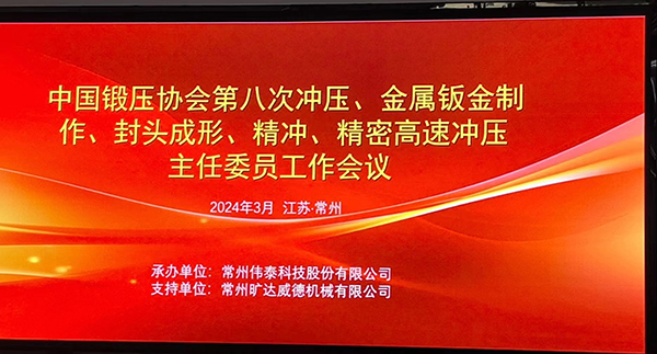 2024年3月20日中國鍛壓協(xié)會(huì)第八次沖壓、金屬鈑金制作、封頭成形、精沖、精密高速?zèng)_壓主任委員工作會(huì)議在江蘇常州順利召開。會(huì)后,協(xié)會(huì)執(zhí)行副理事長(zhǎng)張金、副理事長(zhǎng)齊俊河及各分會(huì)主任委員一行來到常州曠達(dá)威德機(jī)械有限公司交流指導(dǎo)。