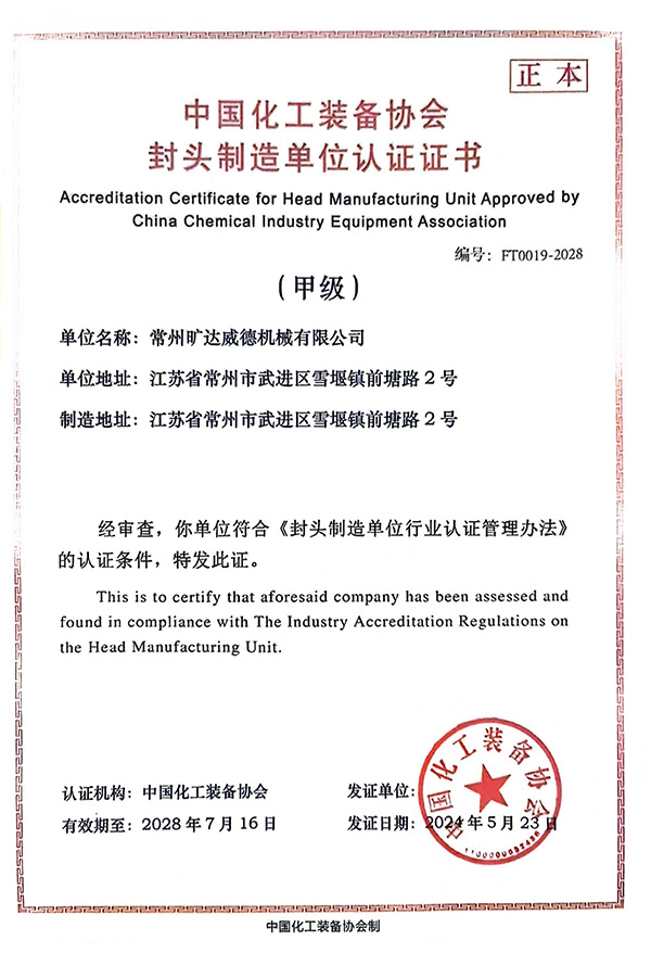 2024年4月27日,中國(guó)化工裝備協(xié)會(huì)三位專(zhuān)家組成的評(píng)審組,對(duì)常州曠達(dá)威德機(jī)械有限公司封頭制造單位認(rèn)證證書(shū)(甲級(jí))換證進(jìn)行了現(xiàn)場(chǎng)審查。