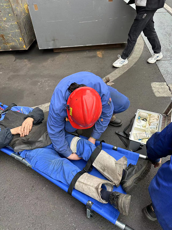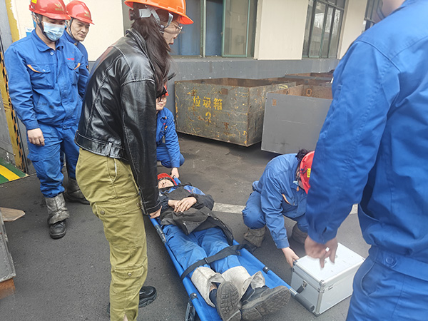 演練開始,我們模擬了叉車作業(yè)時由于未注意周圍情況,撞倒正在路過的巡檢人員的傷害事故。事故發(fā)生以后,行人第一時間大聲呼救,喊停叉車,叉車司機立即停車,并下車查看傷者情況,立即向周圍人員及車間負責(zé)人報告,反映有關(guān)情況,車間負責(zé)人在收到有人員受傷報告后,立即組織人員檢查傷情,對受傷出血部位采取止血措施,檢查是否有骨折,并立即撥打120向當?shù)蒯t(yī)院取得聯(lián)系,詳細說明事故地點、受傷嚴重程度、聯(lián)系電話,并派人到路口接應(yīng)。隨后120急救車輛到達現(xiàn)場,現(xiàn)場人員立即將傷員移交120急救車輛送醫(yī)。