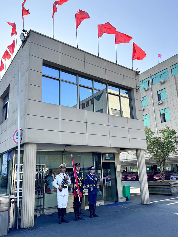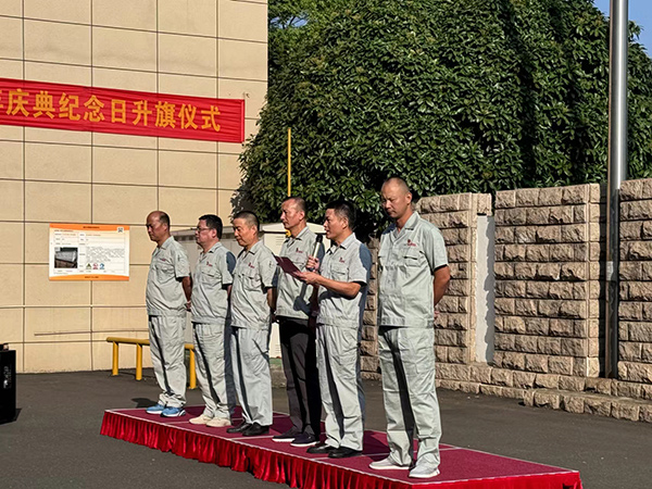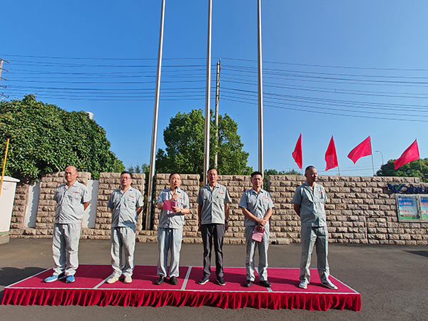 7點56分,公司董事長曹立宏、總經理楊慶高、副總經理龔文偉、副總經理常立寒、總經理助理兼經營銷售部部長曹立峰和總經理助理兼生產管理部部長吳亦平站上主席臺,主持人龔總首先向大家介紹了參加升旗儀式的公司領導。7點58分龔總宣布升旗儀式正式開始,隨著“迎國旗”的口號,大家行注目禮迎接儀仗隊護旗至旗桿下,在大家齊聲高唱雄壯有力的國歌時,鮮艷的五星紅旗冉冉升起,現(xiàn)場彌漫著一種莊嚴肅穆的氣息,一股愛國、愛企的熱情油然而生。