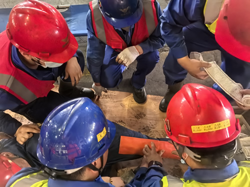 《有限空間事故專項應(yīng)急預(yù)案》演練模擬了在 FM10基坑內(nèi),下夾緊缸故障維修過程中,作業(yè)人員未進行有毒有害介質(zhì)有效隔離,未實施停電,掛牌進入有限空間,未執(zhí)行有限空間作業(yè)審批“先通風(fēng)、后檢測、再作業(yè)”規(guī)定,導(dǎo)致一名維修人員中毒、窒息、昏迷,同時作業(yè)現(xiàn)場內(nèi)有刺鼻異味。監(jiān)護人員發(fā)現(xiàn)異常后,立即報告并呼叫救援。應(yīng)急救援人員迅速穿戴好防護裝備,攜帶空氣呼吸器、擔(dān)架等救援設(shè)備進入有限空間,將昏迷員工轉(zhuǎn)移至安全區(qū)域,并進行心肺復(fù)蘇等急救措施,成功將“傷員”從危險中解救出來,展現(xiàn)了公司在應(yīng)對有限空間事故時的專業(yè)救援能力。
