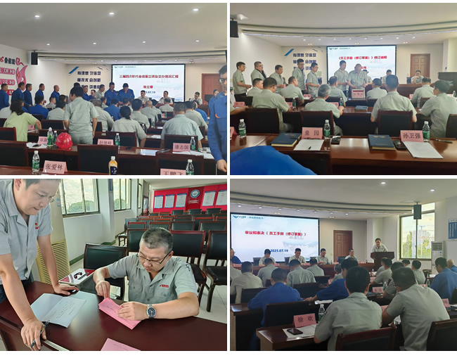 在會議進程中,龔文偉副總經(jīng)理就《員工手冊(修訂草案)》向大會作了詳盡且清晰的說明。他不僅闡述了修訂的背景和目的,還匯報了草案征求代表意見的情況,并且根據(jù)征集來的修改意見對員工手冊的哪些部分進行了更新和更改也做了概述,這一過程充分體現(xiàn)了對員工意見的尊重和重視。為了更好地發(fā)揚民主精神,切實保障員工的知情權、參與權和表決權,全體代表對《員工手冊(修訂草案)》進行了無記名投票表決。代表們認真地填寫選票,投下自己神圣的一票,這一環(huán)節(jié)充分展現(xiàn)了民主決策的魅力。最終大會以57票贊成、1票棄權的結果通過了《員工手冊(修訂草案)》。