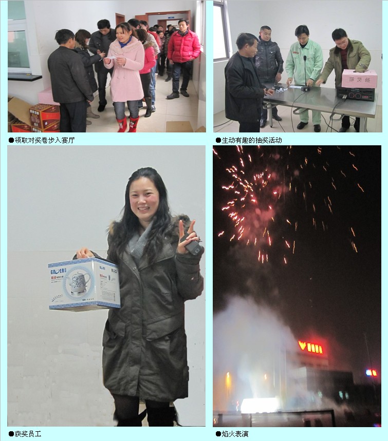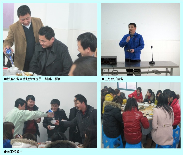 首先,王健總經理致開宴辭,王總在致辭中指出:過去的一年經過大家的努力,公司實現(xiàn)了設備、技術、人才、市場的重大跨越,取得了“六證”,榮獲六項國家專利,同時公司也取得了飛速的發(fā)展。王總對大家一年來的傾情付出表示衷心的感謝,并借春節(jié)來臨之際祝全體員工身體健康、合家幸福。