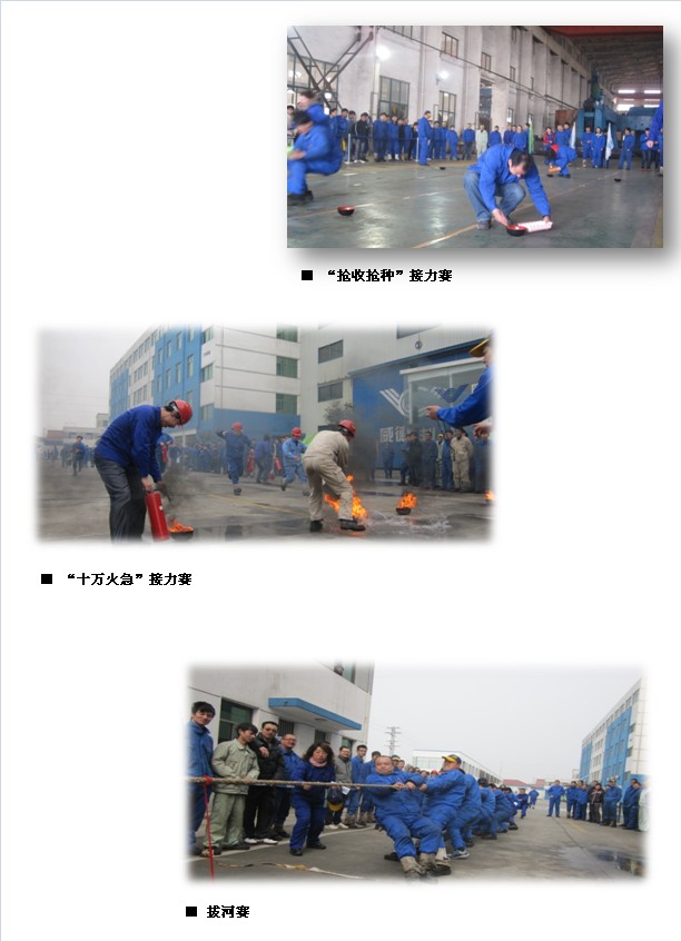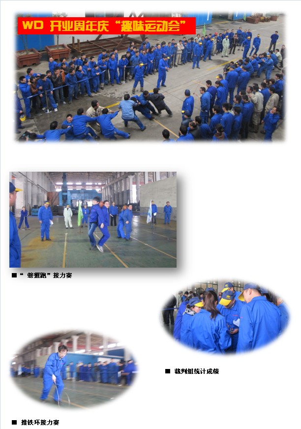 本屆趣味運(yùn)動會共進(jìn)行5項(xiàng)比賽:“螃蟹跑”接力賽、“搶種搶收”接力賽、“推鐵環(huán)”接力賽、“十萬火急”接力賽、拔河比賽,共為全體員工提供了376個(gè)參賽資格,基本實(shí)現(xiàn)了人人都可報(bào)名參加。舉辦廠慶運(yùn)動會的通知貼出去以后,許多員工都到各自領(lǐng)隊(duì)那兒踴躍報(bào)名,他們被劃分為8個(gè)代表隊(duì):焊接科代表隊(duì)、成形科代表隊(duì)、后序科代表隊(duì)、切割中心代表隊(duì)、管理、經(jīng)營、總經(jīng)辦、供應(yīng)部聯(lián)隊(duì)、技術(shù)、總務(wù)、財(cái)務(wù)部聯(lián)隊(duì)、質(zhì)保部代表隊(duì)、銷售公司代表隊(duì)。另外為保證運(yùn)動會的順利進(jìn)行,運(yùn)動會組委會設(shè)立3名正、副主任委員、2名正、副裁判長、16名裁判、4名記錄員、2名調(diào)度員、2名播音員、2名安全監(jiān)督員、3名后勤及供應(yīng)保障人員、1名攝影人員、2名場地與器材準(zhǔn)備人員和1名醫(yī)療衛(wèi)生人員,總務(wù)部牽頭負(fù)責(zé)相關(guān)聯(lián)絡(luò)事宜。每項(xiàng)比賽都設(shè)立一、二、三等獎。最后為獲得一、二、三等獎的隊(duì)員發(fā)放了相應(yīng)的獎品,并為沒有獲獎的參賽人員發(fā)放了紀(jì)念品。